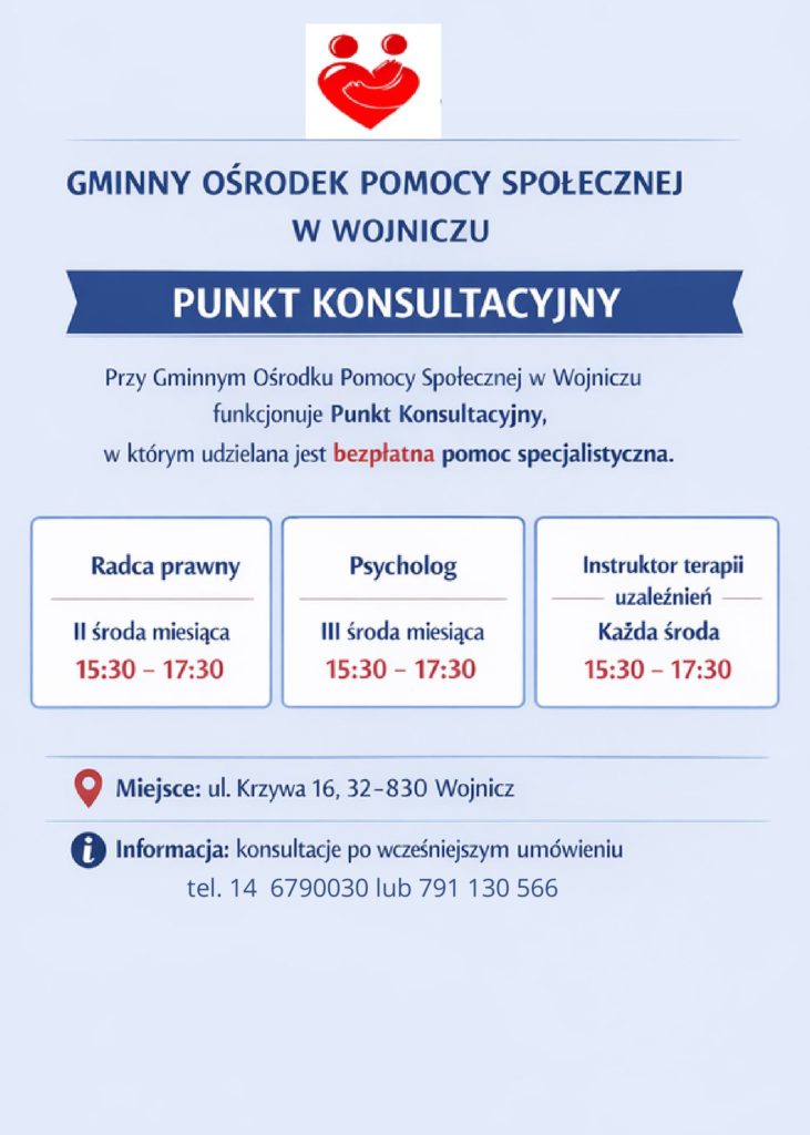 Gminny Ośrodek Pomocy Społecznej w Wojniczu informuje, że przy Ośrodku działa Punkt Konsultacyjny, w którym mieszkańcy Gminy Wojnicz mogą skorzystać z bezpłatnych porad specjalistycznych.