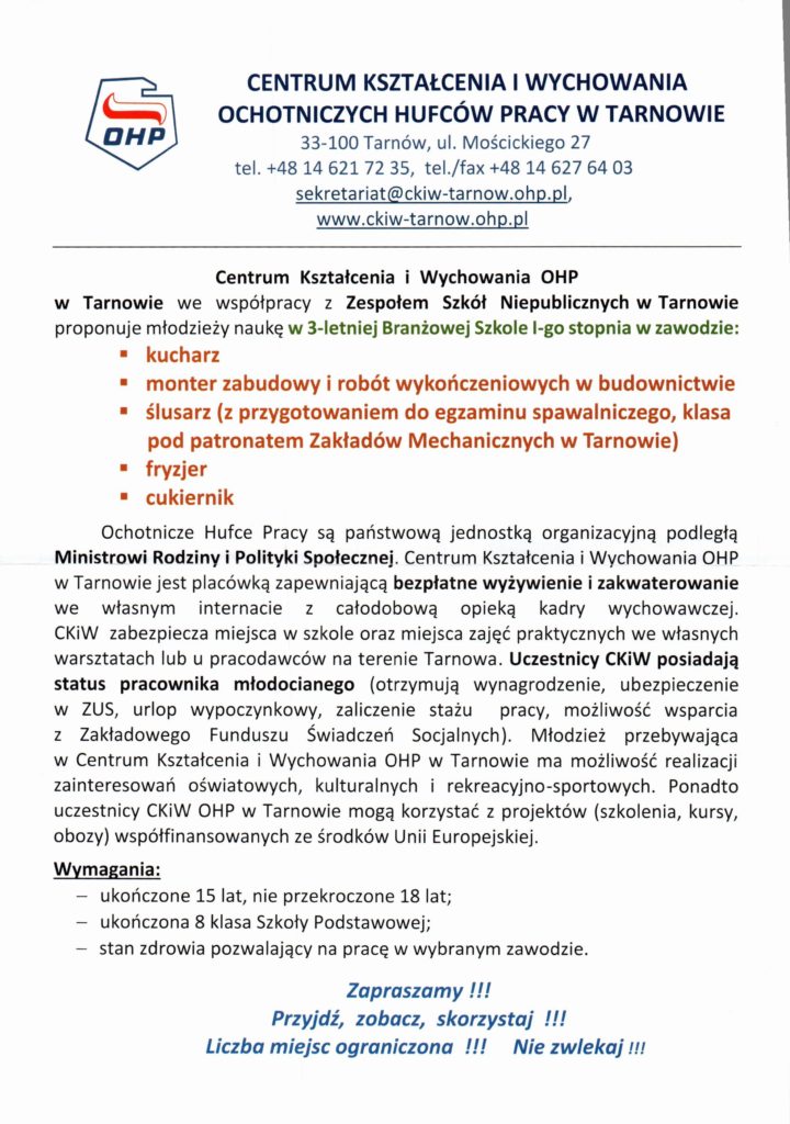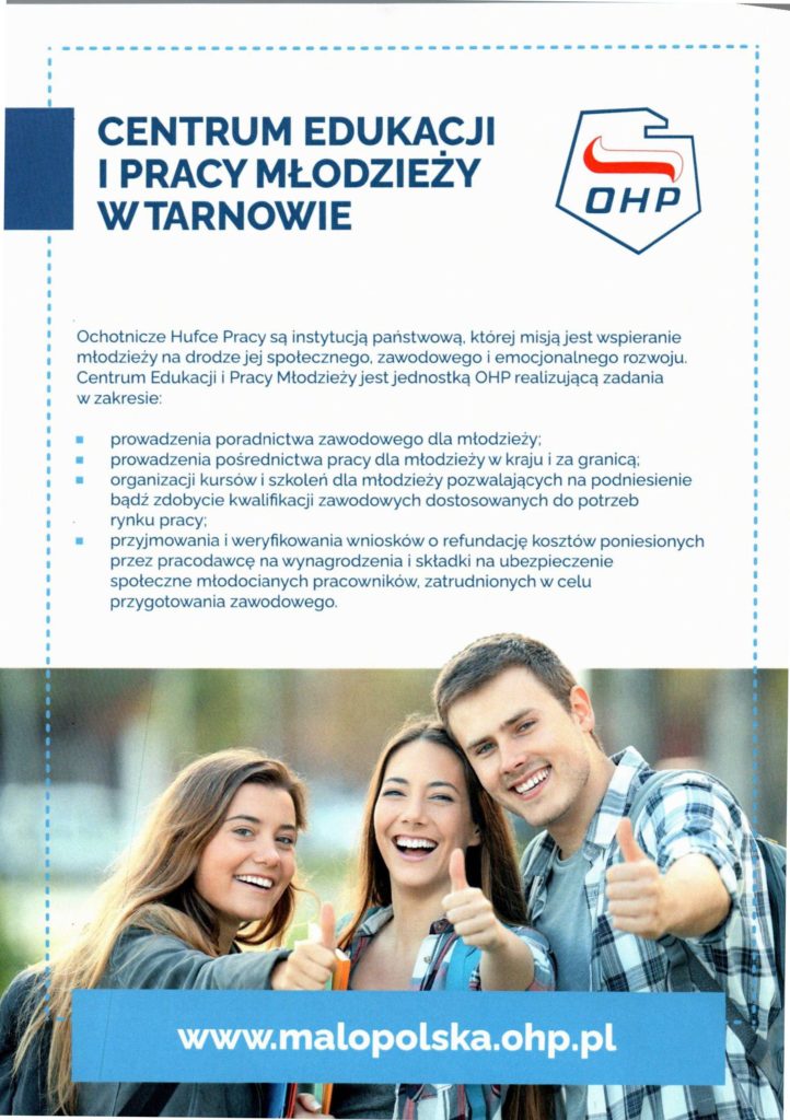 Ochotnicze Hufce Pracy (OHP), jako wyspecjalizowana instytucja rynku pracy, oferują bezpłatne kompleksowe wsparcie dla młodzieży (15-25 lat, a w wybranych działaniach do 30 lat) oraz pracodawców. Obejmuje ono pośrednictwo pracy, poradnictwo zawodowe, szkolenia, kształcenie i wychowanie, a także wsparcie socjalne, w tym zakwaterowanie i wyżywienie.